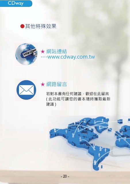 CDway ●其他特殊效果 ★ 網站連結 ---www.cdway.com.tw ★ 網路留言 若對本書有任何建議,歡迎在此留言 ( 此功能可讓您的書本隨時獲取最新 建議 ) - 20 -