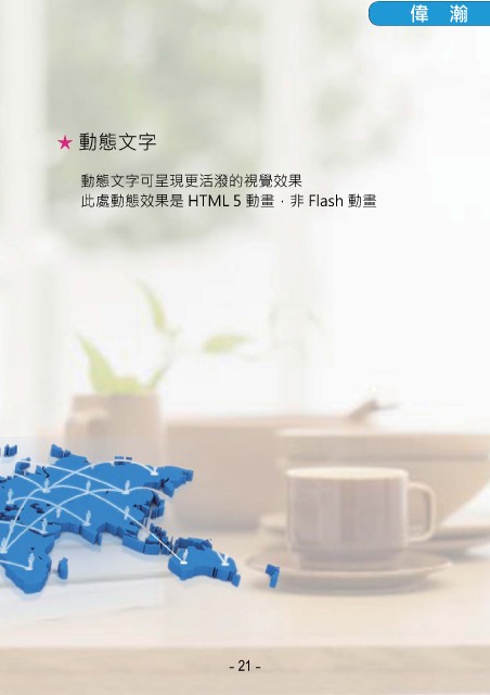 偉 瀚 ★ 動態文字 動態文字可呈現更活潑的視覺效果 此處動態效果是 HTML 5 動畫,非 Flash 動畫 - 21 -