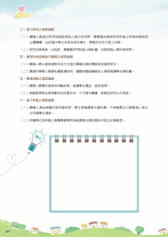 (一)輔導人員進行研究或協助其他人進行研究時,應尊重並確保研究對象之知情同意與自