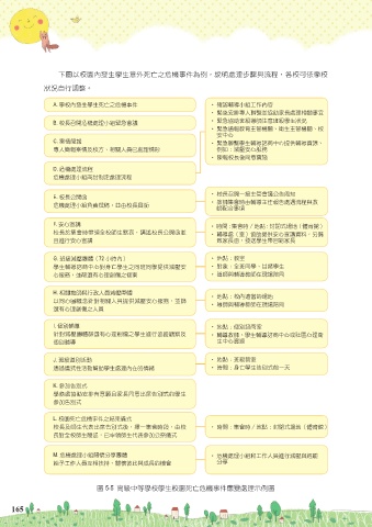 下圖以校園內發生學生意外死亡之危機事件為例,說明處理步驟與流程,各校可依學校