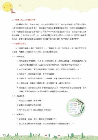 以下就學校輔導人員的「專業展現」、「督導進修」與「行政參與」等三個向度提供評