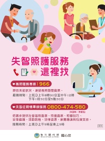失智照護服務 這裡找 長照服務專線 1966 評估失能狀況,連結長照相關資源。 服務時間:上班日上午8時30分至中午12時 下午1時30分至5點30分 失智症關懷專線服務 0800-474-580 (失智時,我幫您) 依需求提供社會福利資源、照護資源、照顧技巧、 安全維護、活動訊息、法律資源、家屬調適與心理支持。 服務時間:上班日上午9時至晚上9時