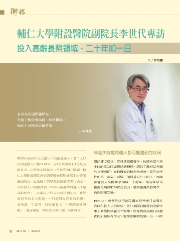 兼副院長,也是輔大醫學院教授的李世代表示, 際會投入高齡醫學領域二十餘年,從各種層面