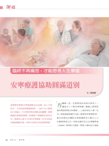 在臨終擺脫苦痛,尋得生命真正的意義與價值。 任暨精神部主任,同時也擔任亞太安寧醫學會