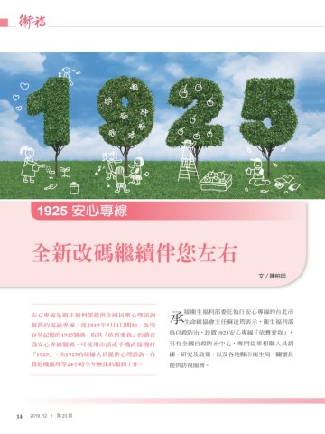 「1 925」,由1925的接線人員提供心理諮詢、自 練、研究及政策,以及各地縣市衛生局、關懷員